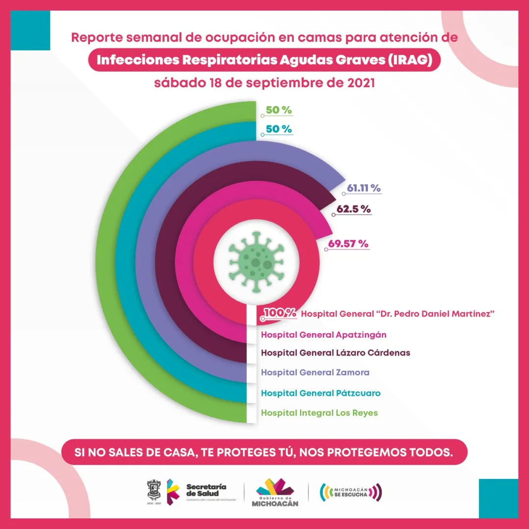 Morelia, Michoacán, a 18 de septiembre de 2021.- La Secretaría de Salud de Michoacán (SSM), informa que la ocupación de camas para la atención de Infecciones Respiratorias Agudas Graves (IRAG), en el Hospital General de Uruapan “Dr. Pedro Daniel Martínez”, registra el 100 por ciento de su capacidad hospitalaria.