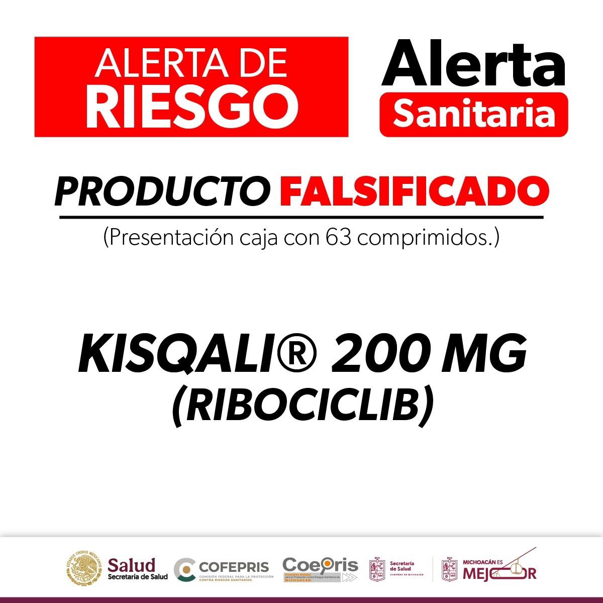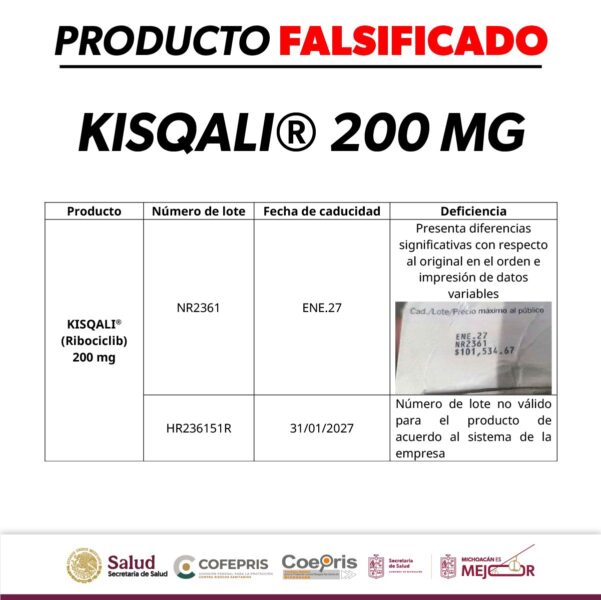 La Comisión Federal para la Protección contra Riesgos Sanitarios (Cofepris), a través de la Secretaría de Salud de Michoacán (SSM), notificó sobre la detección de ejemplares falsificados del medicamento Kisqali (ribociclib) de 200 mg, utilizado en tratamientos contra el cáncer.