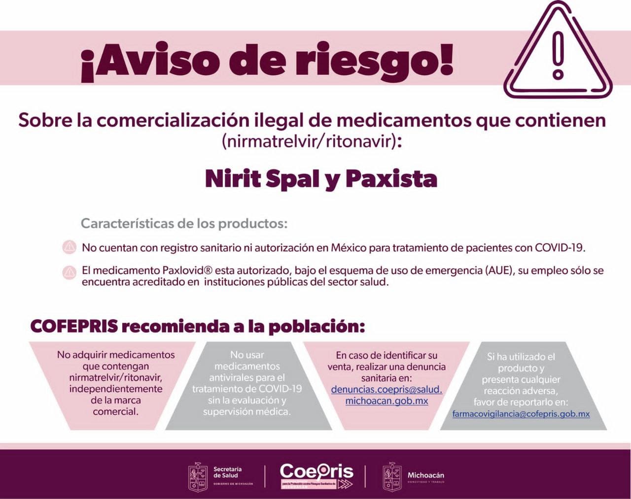 Morelia, Michoacán, 27 de abril de 2023. La Comisión Federal para la Protección contra Riesgos Sanitarios (Cofepris), a través de la Secretaría de Salud de Michoacán (SSM), informa a los profesionales de la salud y a la población en general sobre la venta ilegal de medicamentos denominados Nirit, Spal y Paxista, que contienen (nirmatrelvir/ritonavir), los cuales no cuentan con registro sanitario ni con autorización en México para el tratamiento de pacientes con COVID-19, por lo que su uso representa un riesgo para la salud.