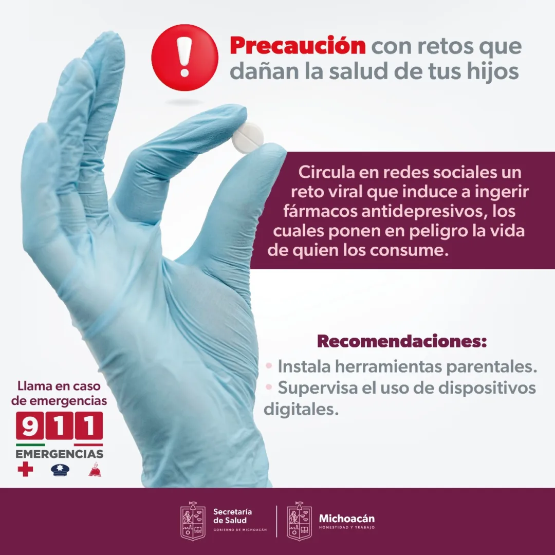 Morelia, Michoacán, 20 de enero del 2023.- Luego de que en redes sociales se hiciera popular un peligroso juego, en el que invitan a que los adolescentes y niños a ingerir fármacos antidepresivos, para poner a prueba el tiempo en que el medicamento hace reacción, la Secretaría de Salud de Michoacán (SSM) alerta a la población a vigilar a sus hijos y evitar así una intoxicación, problemas respiratorios, sedación, inducción al coma e incluso la muerte.