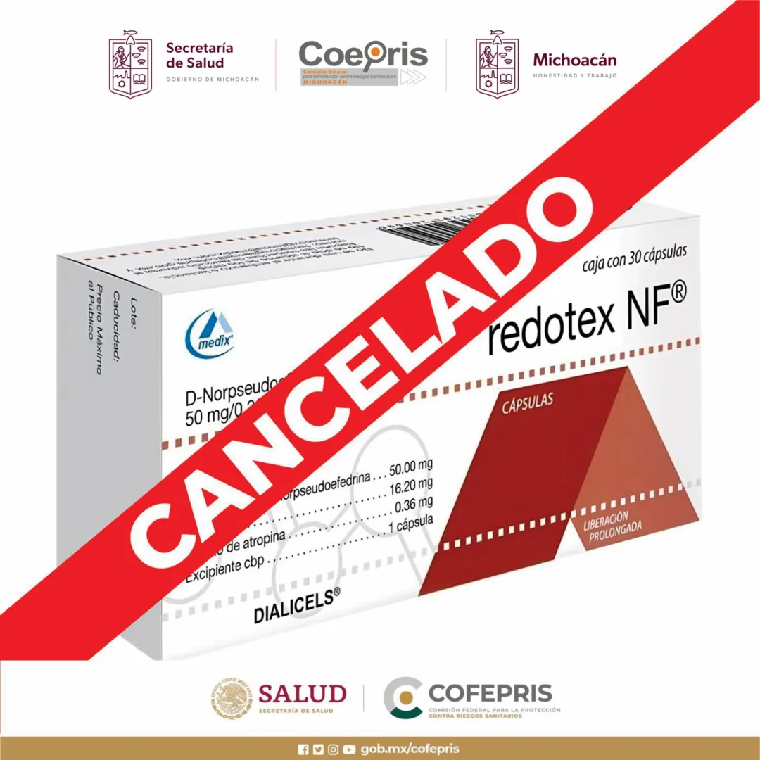 Morelia, Michoacán, 19 de mayo de 2023.- La Comisión Federal para la Protección contra Riesgos Sanitarios (Cofepris), a través de la Secretaría de Salud de Michoacán (SSM), informa a la población sobre la cancelación del medicamento Redotex y Redotex NF, al determinar que su consumo representa un alto riesgo a la salud, derivado de la cantidad de reacciones adversas registradas y las sustancias dañinas que contienen.