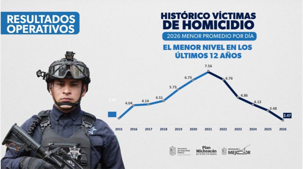 El gobernador Alfredo Ramírez Bedolla informó que, durante el transcurso del año 2026, el estado de Michoacán registra un promedio diario de 2.47 víctimas de homicidio doloso. Según los datos presentados por el mandatario, esta cifra representa el nivel más bajo observado en este indicador en los últimos 12 años dentro de la entidad.