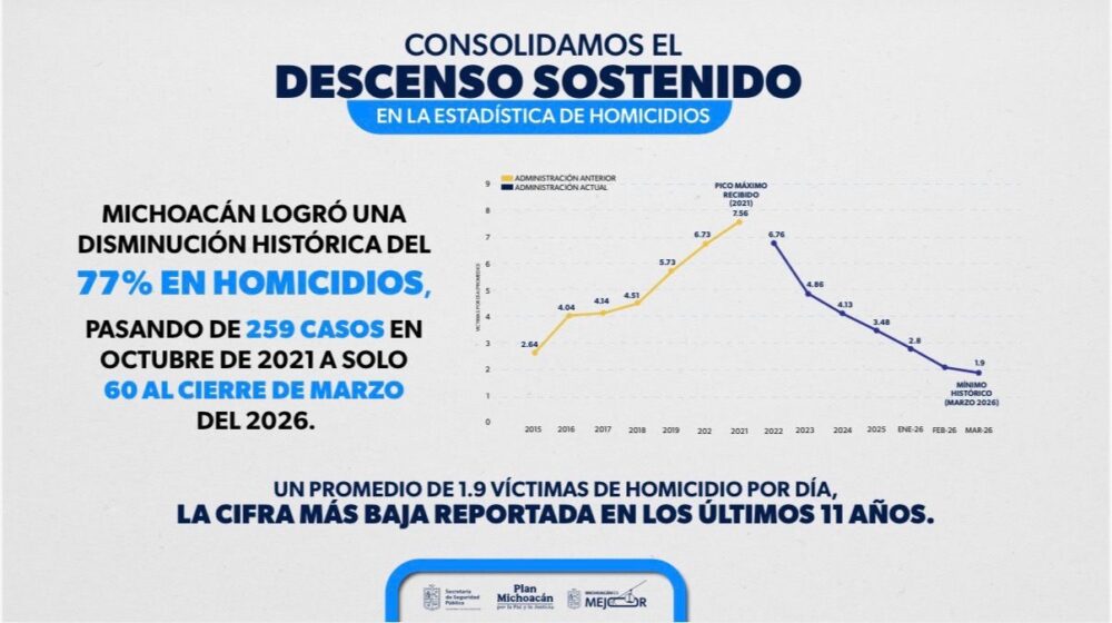 Durante la presentación de los indicadores de seguridad, el mandatario estatal detalló que la incidencia pasó de 259 víctimas mensuales en 2021 a las 60 contabilizadas el mes pasado. Según las cifras expuestas por el Ejecutivo estatal, la entidad mantiene una tendencia a la baja en este delito, con un promedio actual de 1.9 casos diarios, en comparación con los siete homicidios diarios que se registraban en el año 2021.