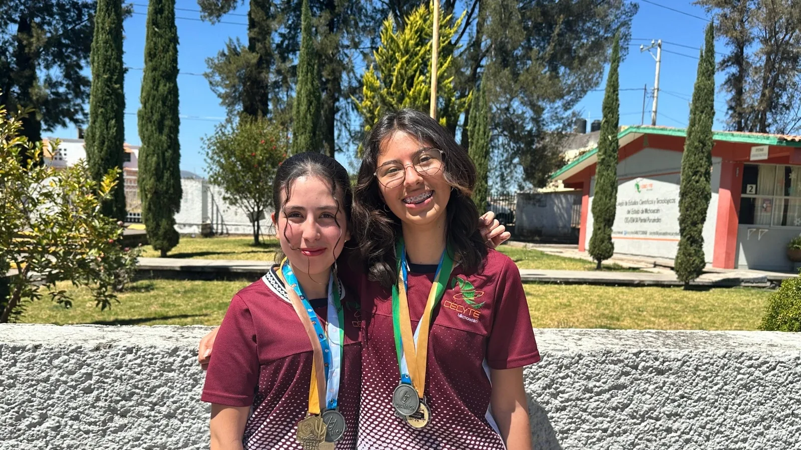 Puruándiro, Michoacán, 8 de marzo de 2024.- Emily Amairany Ruiz Rentería y Frida Erandi Salas Aguirre son alumnas destacadas del Colegio de Estudios Científicos y Tecnológicos del Estado de Michoacán (Cecytem), plantel Puruándiro, quienes han puesto en alto al estado en competencias de ciencias.