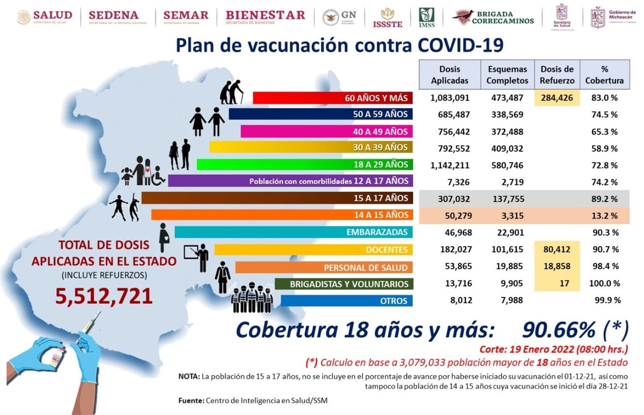 Hasta este 20 de enero del año en curso se han aplicado en Michoacán un total de 5 millones 512 dosis y al menos el 90.6% de la población, mayor de 18 años, ya cuenta con al menos una dosis aplicada. Además, se han aplicado 284 mil dosis de refuerzo a los mayores de 60 años, 80 mil a igual numero de docentes y 18 mil a personal de salud del nivel público y privado.