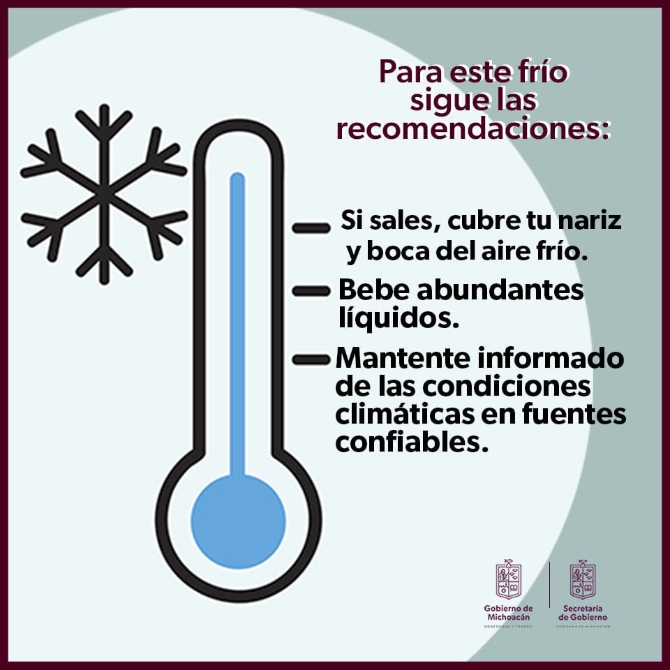 Morelia, Michoacán; 2 de diciembre de 2021.- Ante las bajas temperaturas que continuarán en Michoacán, la Secretaría de Gobierno a través de la Coordinación Estatal de Protección Civil, exhorta a la población a mantenerse al pendiente de las condiciones meteorológicas en fuentes oficiales y seguir recomendaciones de autoprotección.
