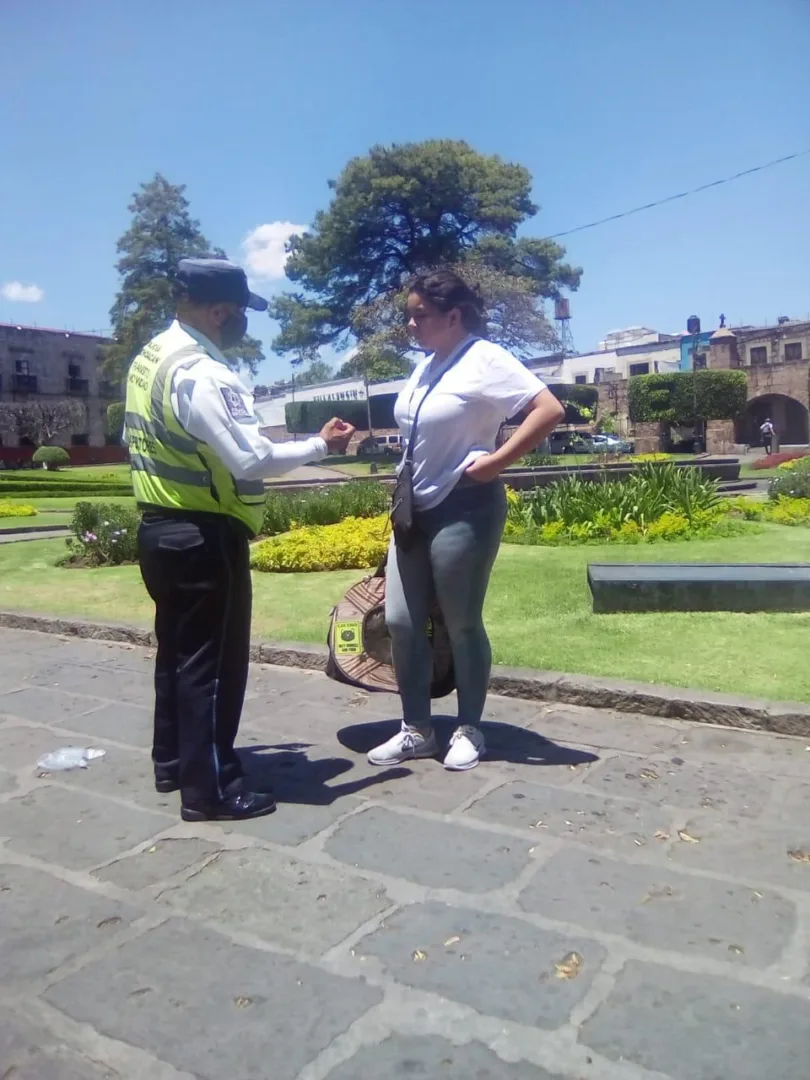 Elementos de Tránsito y Movilidad de la Policía Michoacán llevan a cabo en el Centro Histórico trabajos de difusión de las diferentes recomendaciones sanitarias, a fin de hacer frente al coronavirus.