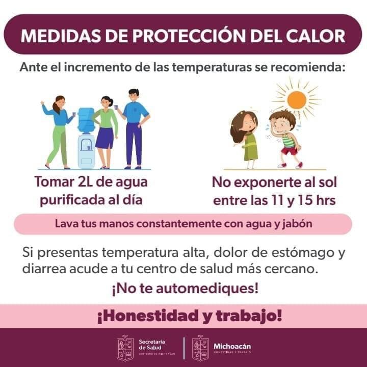 Morelia, Michoacán, 11 de junio de 2023.- De acuerdo con el reporte emitido por el Sistema Meteorológico Nacional, se prevé que continúe la tercera ola de calor con temperaturas máximas de entre 40 y 45 grados en 20 estados del país, entre ellos Michoacán, es así que la Secretaría de Salud del Estado (SSM) exhorta a la población a extremar precauciones para evitar golpes de calor y deshidratación.