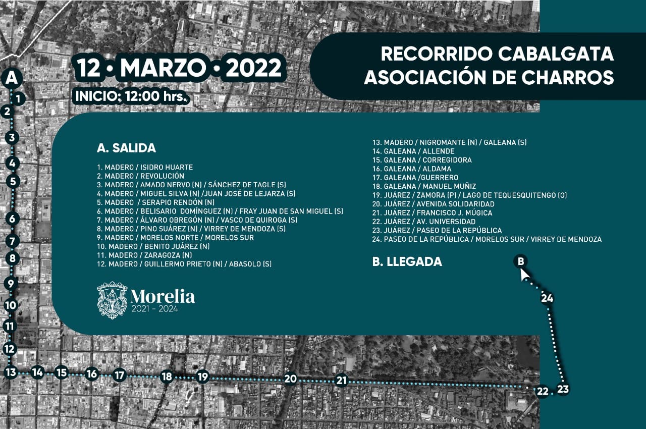 Morelia, Michoacán; a 11 de marzo de 2022.- En el marco del desfile que se realizará para celebrar los 100 años de la fundación de la Asociación de Charros de Morelia, el Gobierno Municipal informa a las y los morelianos que este sábado 12 de marzo se cerrarán algunas calles del Primer Cuadro del centro de la capital michoacana.
