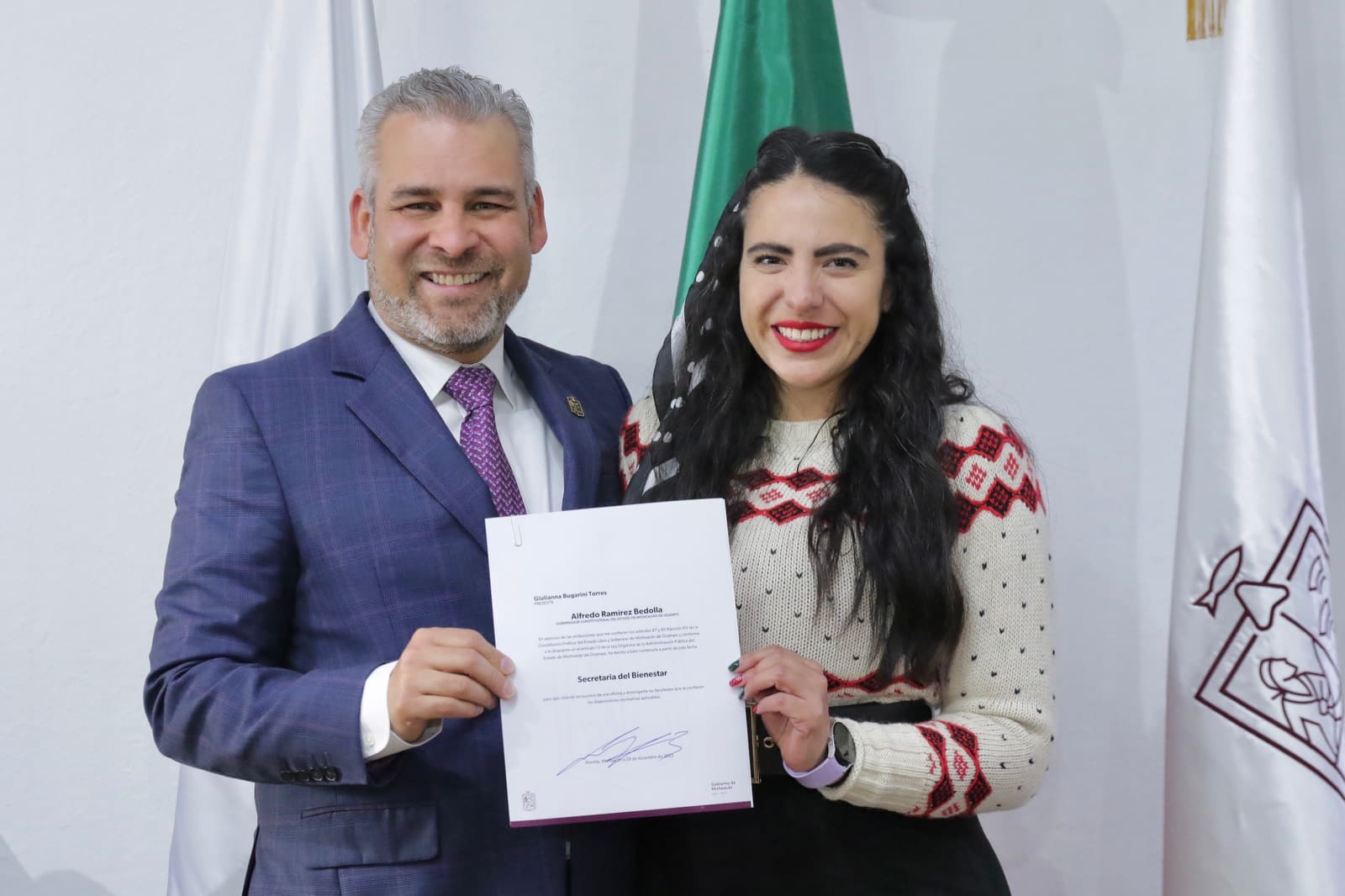 Morelia, Michoacán, 28 de diciembre del 2022.- El gobernador Alfredo Ramírez Bedolla anunció que Giulianna Bugarini Torres asume la titularidad de la Secretaría de Bienestar, y Carolina Rangel Gracida estará al frente de la Secretaría de Igualdad Sustantiva y Desarrollo de las Mujeres (Seimujer).