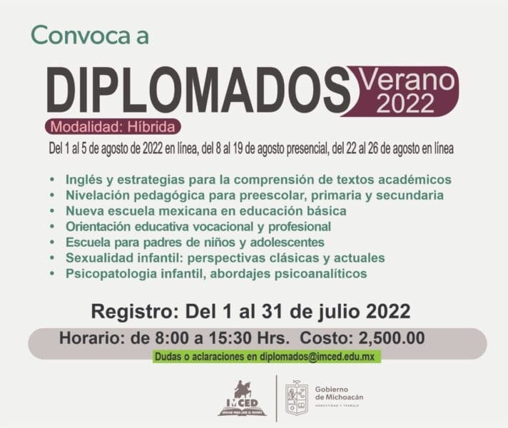 El registro podrá hacerse del 01 al 31 de julio en la página https://imced.edu.mx/oferta-diplomados/, haciendo el pago antes del inicio de clases.
