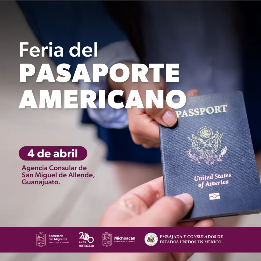 Morelia, Michoacán, 5 de febrero de 2024.- El próximo 4 de abril, la Agencia Consular de San Miguel de Allende, Guanajuato, llevará a cabo la Feria de Pasaportes Americanos, donde Michoacán es considerado para que hijas e hijos estadounidenses de padres mexicanos puedan obtener este documento, informó la titular de la Secretaría del Migrante (Semigrante), María Teresa Mora Covarrubias.