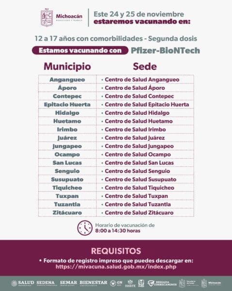 Los centros de salud de Zitácuaro, Angangueo, Áporo, Contepec, Epitacio Huerta, Hidalgo, Huetamo, Irimbo, Juárez, Jungapeo, Ocampo, San Lucas, Senguio, Susupuato, Tiquicheo, Tuxpan y Tuzantla serán los que vacunarán segundas dosis y refuerzo con Pfizer a todos los mayores de 18 años que se encuentren en rezago.