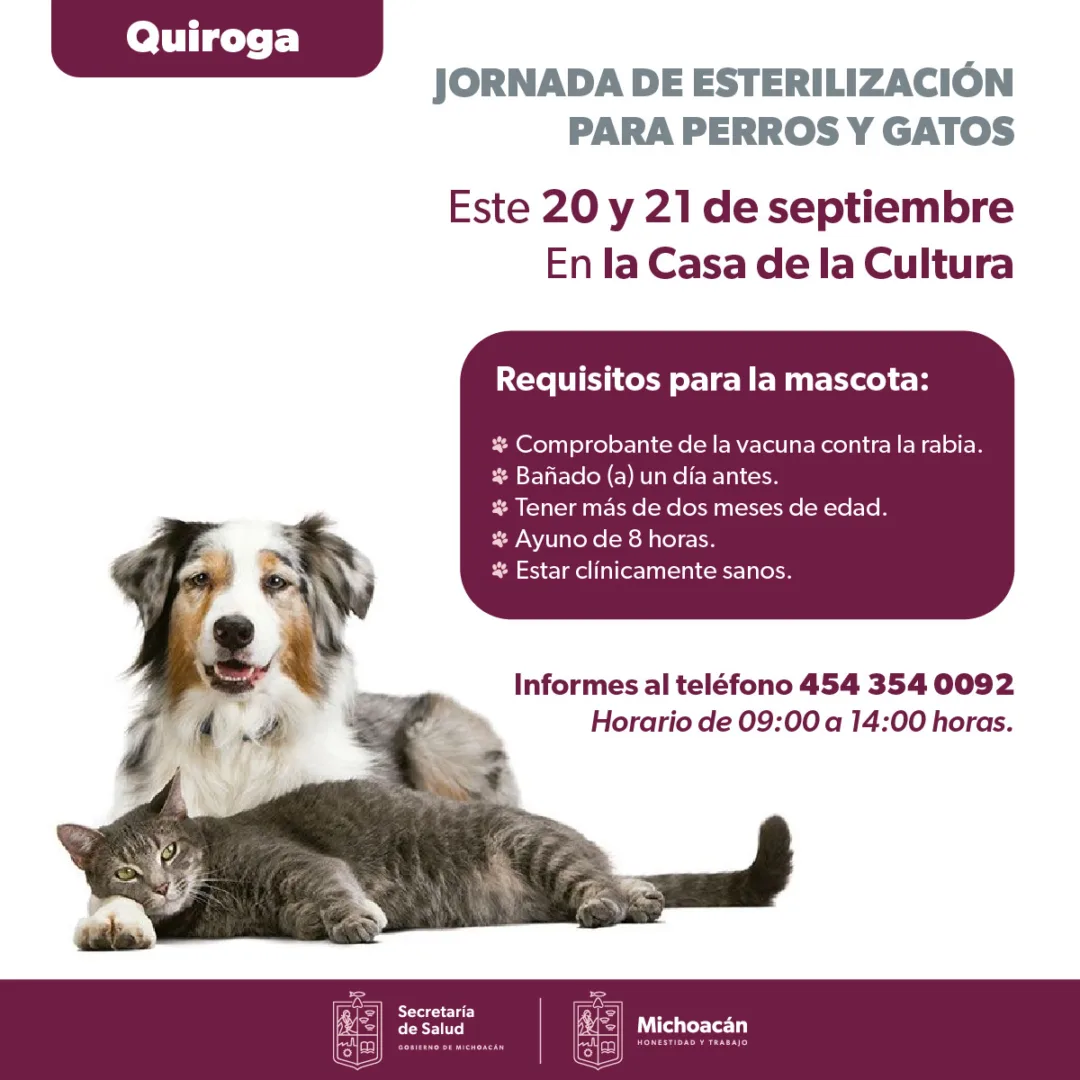 Morelia, Michoacán, 19 de septiembre de 2023.- La Secretaría de Salud de Michoacán (SSM) y el Ayuntamiento de Quiroga realizarán una jornada de esterilización canina y felina los días 20 y 21 de septiembre, en las instalaciones de la Casa de la Cultura de dicho municipio.