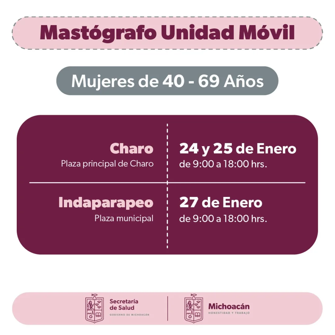 El viernes 27 de enero, un mastógrafo móvil de la SSM estará en la plaza principal de Indaparapeo, con atención de 09:00 a 18:00 horas. Los espacios pueden programarse en las oficinas del DIF municipal, así como en los centros de salud de Las Palmas y la colonia Centro.