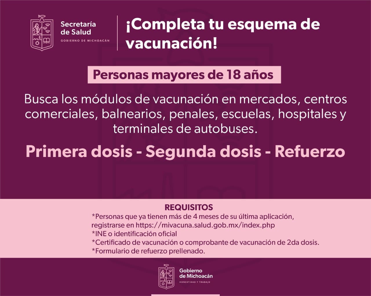 Morelia, Michoacán a 17 de abril del 2022.- La Secretaría de Salud de Michoacán (SSM), informa a la población que durante todo el mes de abril, arrancará en la entidad una nueva estrategia para vacunar contra el Covid-19 a todos los mayores de 18 años y que por ello, se activarán brigadas de vacunación en: mercados, centros comerciales, balnearios, penales y escuelas del nivel medio superior.