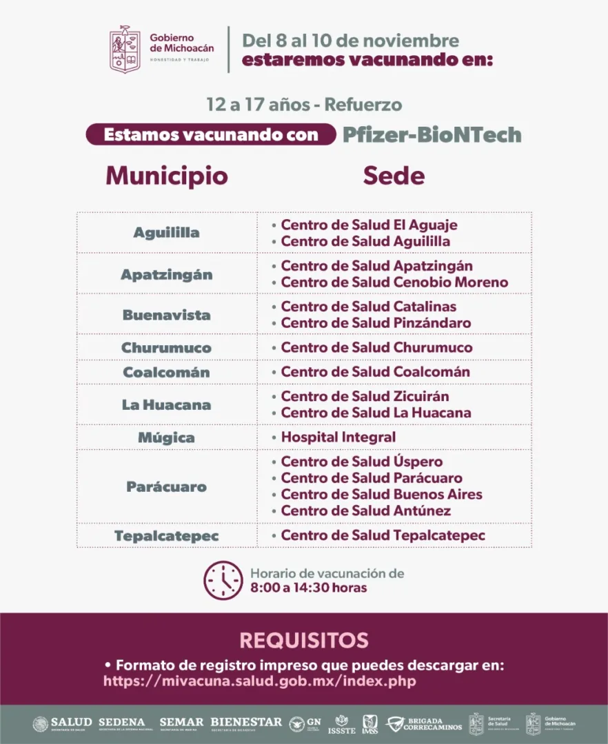 El refuerzo será aplicado del 8 al 10 de noviembre en los municipios de Aguililla, Apatzingán, Buenavista, Churumuco, Coalcomán, La Huacana, Múgica, Parácuaro y Tepalcatepec, en un horario de atención de 8:00 a 14:30 horas y las sedes estarán publicadas en las páginas oficiales de la SSM.