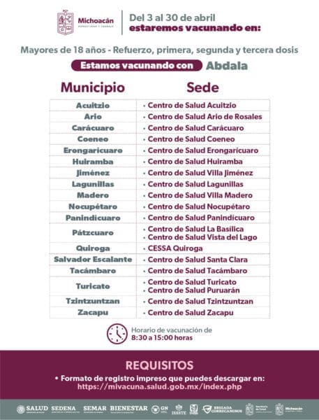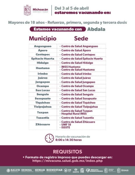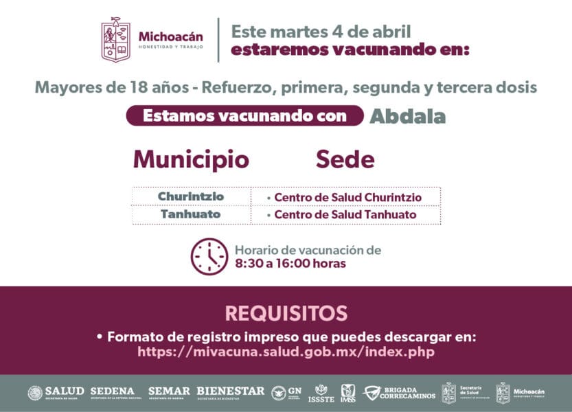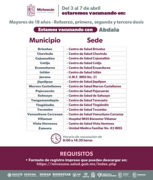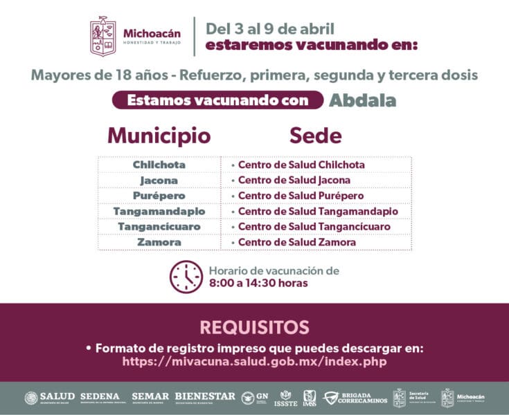 Morelia, Michoacán, 2 de abril de 2023.- Del 3 al 6 de abril se realizarán intensas jornadas de vacunación contra el COVID-19 en 88 municipios de la entidad, para atender a la población mayor de 18 años y aplicar primeras, segundas y terceras dosis del biológico Abdala.