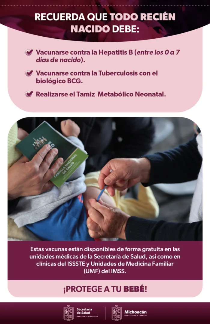 Estas vacunas se deben aplicar en el primer mes de nacido, pues ofrecen inmunidad antes de que los menores estén expuestos a enfermedades que podrían ser mortales.