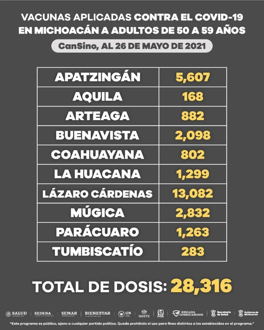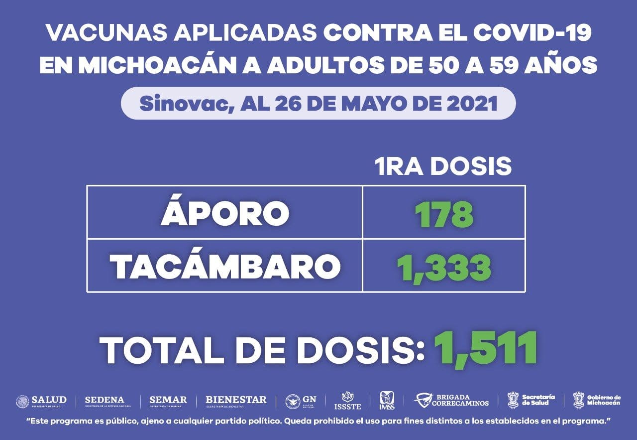 Morelia, Michoacán, a 26 de mayo de 2021.- En la entidad se han aplicado 204 mil 574 dosis de la vacuna anti-COVID-19 a personas de entre 50 y 59 años de edad, informó la Secretaría de Salud de Michoacán (SSM).