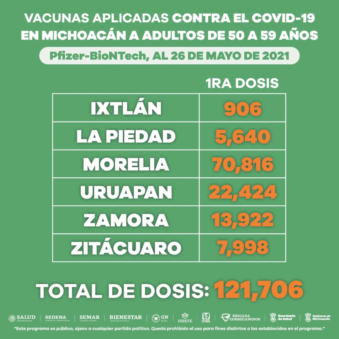 Morelia, Michoacán, a 26 de mayo de 2021.- En la entidad se han aplicado 204 mil 574 dosis de la vacuna anti-COVID-19 a personas de entre 50 y 59 años de edad, informó la Secretaría de Salud de Michoacán (SSM).