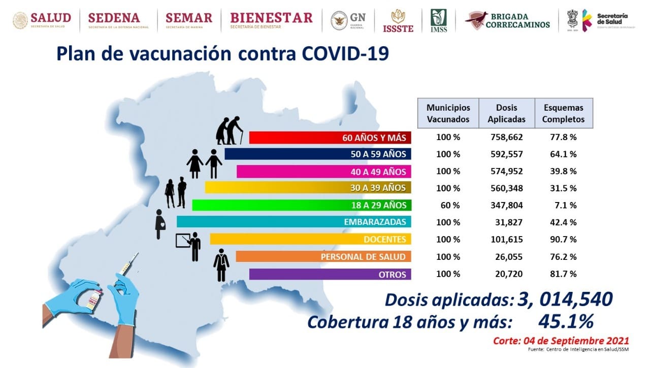 Con lo anterior se alcanzó una cobertura del 45.1 por ciento al corte del 4 de septiembre, mientras que las jornadas de inmunización de diversos grupos etarios continúa.