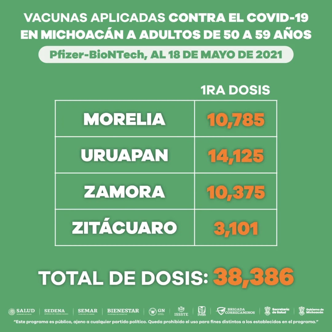 Morelia, Michoacán, a 18 de mayo de 2021.- La vacunación a personas de 50 a 59 años de edad se lleva a cabo en seis municipios de la entidad, en los cuales se han aplicado 42 mil 681 dosis del biológico anti-COVID-19.