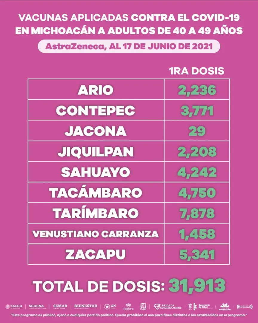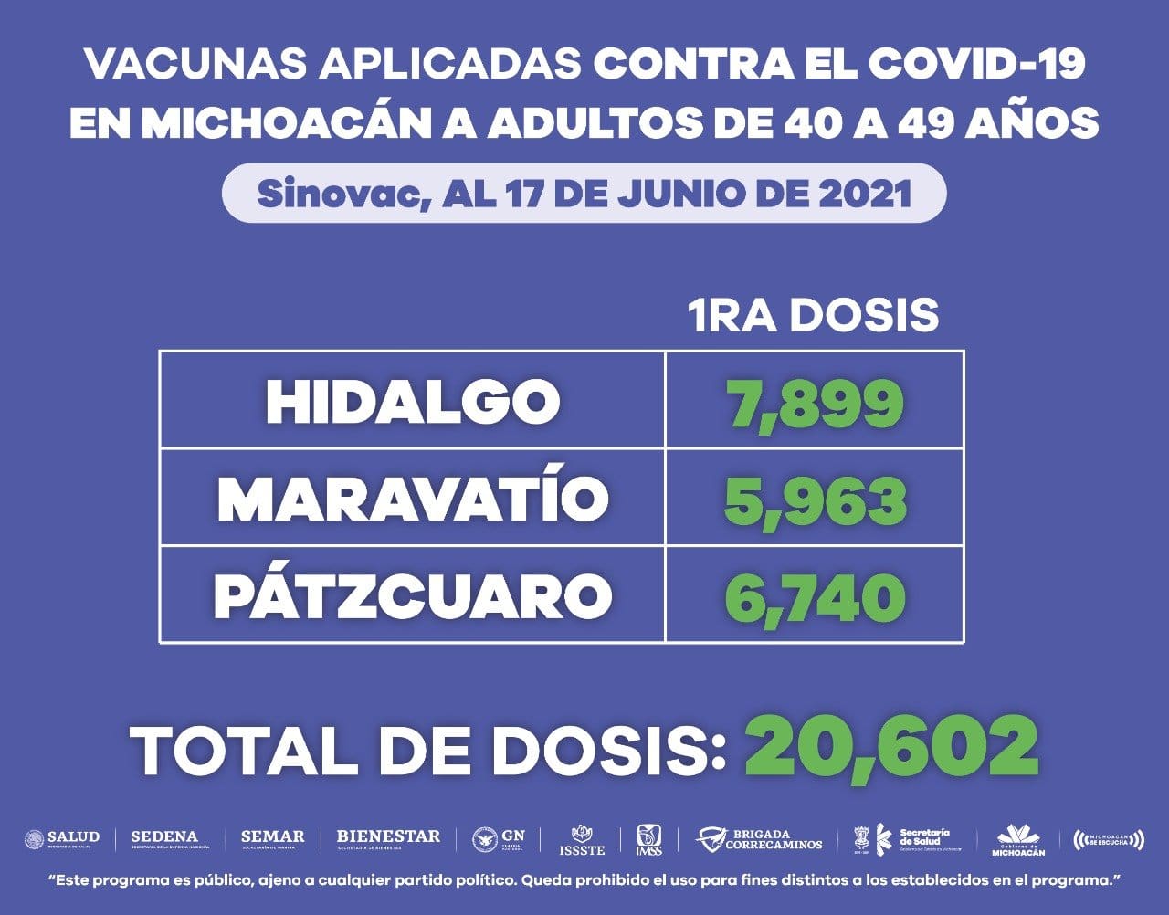 Morelia, Michoacán, a 17 de junio de 2021.- Hasta el día de hoy se han aplicado 83 mil 640 vacunas anti COVID-19 a personas de 40 a 49 años de edad, de 27 municipios de la geografía michoacana.