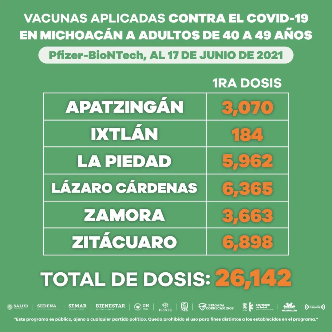 Morelia, Michoacán, a 17 de junio de 2021.- Hasta el día de hoy se han aplicado 83 mil 640 vacunas anti COVID-19 a personas de 40 a 49 años de edad, de 27 municipios de la geografía michoacana.