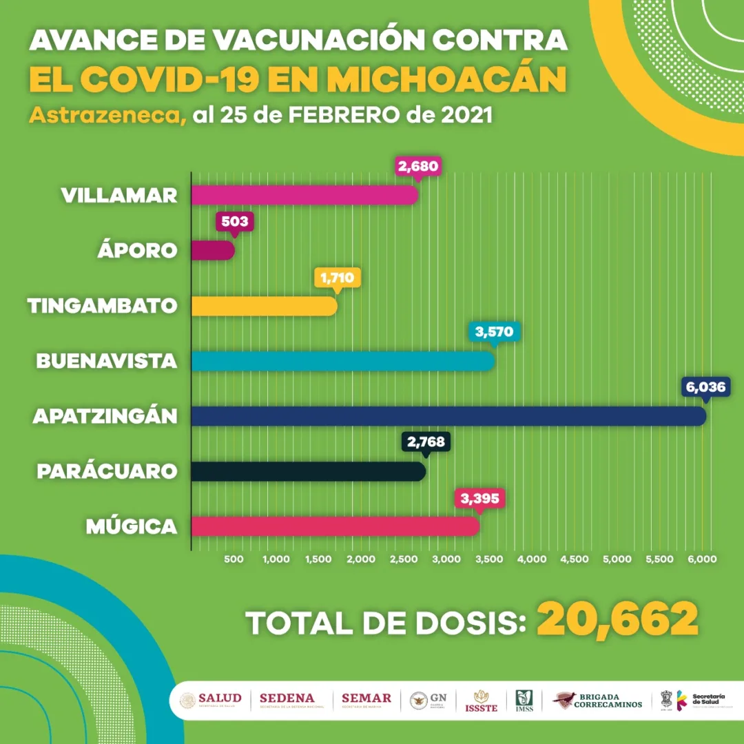 Morelia, Michoacán, a 25 de febrero de 2021.- En la primera etapa de vacunación contra COVID-19 a adultos mayores de 60 años en siete municipios, 20 mil 662 personas han iniciado el esquema de inmunización.