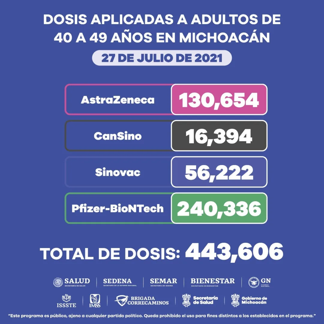 Morelia, Michoacán, a 27 de julio de 2021.- La población de 40 a 49 años ha recibido en total 443 mil 606 dosis de vacuna contra el COVID-19 en la entidad, informó la Secretaría de Salud de Michoacán (SSM).