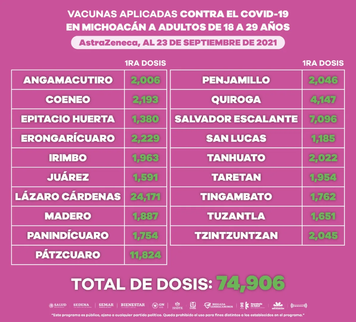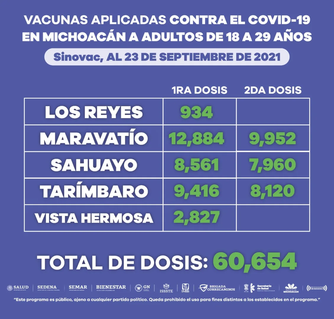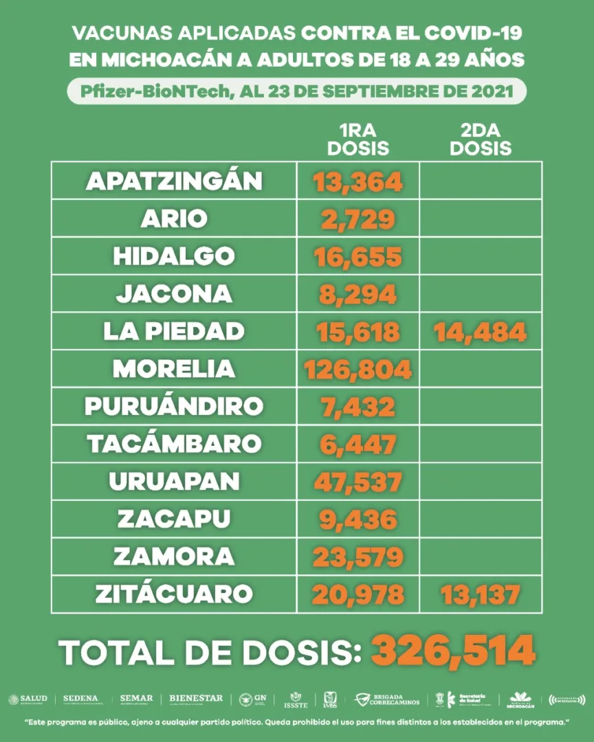 Morelia, Michoacán, a 23 de septiembre de 2021.- A fin de proteger a la población de 18 a 29 años de edad de complicaciones graves en caso de contagiarse de COVID-19, en Michoacán se han aplicado 519 mil 004 dosis de vacuna a este sector.