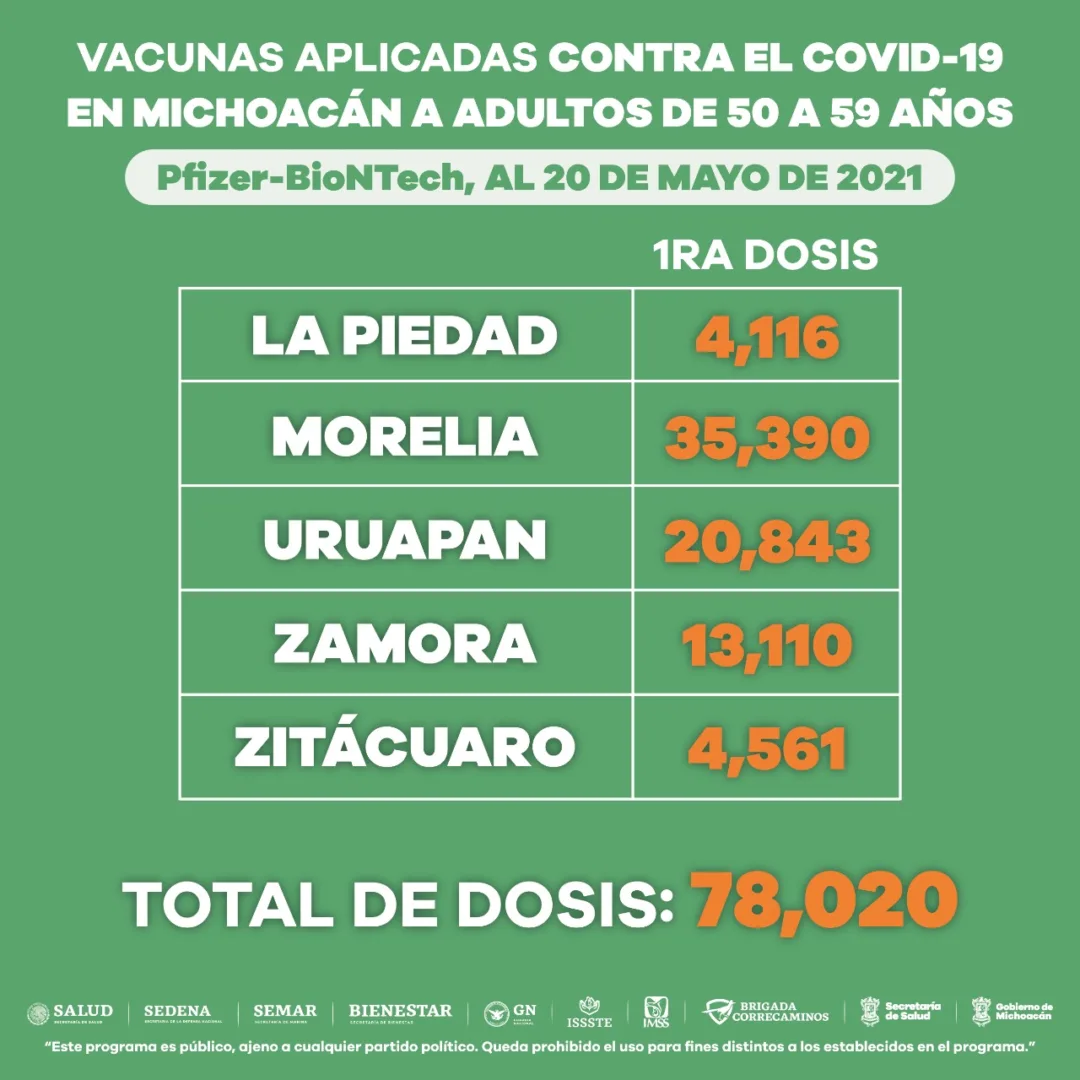 Morelia, Michoacán, a 20 de mayo de 2021.- Hasta el día de hoy, se han aplicado 95 mil 738 dosis de vacuna anti COVID-19, para adultos de 50 a 59 años de 11 municipios.
