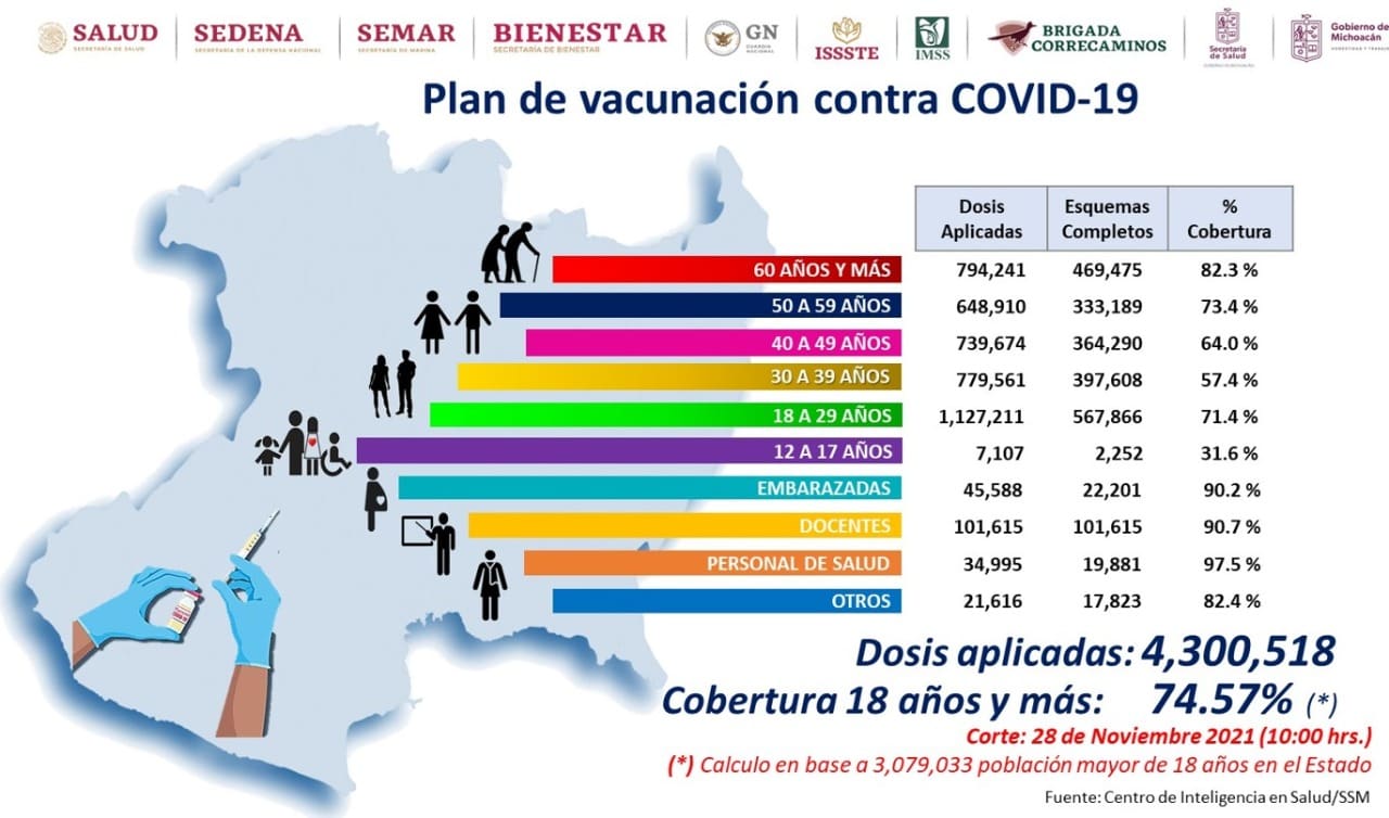 Hasta el momento han sido aplicadas en Michoacán, 4 millones 300 mil 518 dosis de vacuna anti COVID-19, lo cual significa que se ha inmunizado al 74 por ciento de la población de 18 años en adelante, según estadísticas del Centro de Inteligencia en Salud (CIS), de la Secretaría de Salud de Michoacán (SSM).
