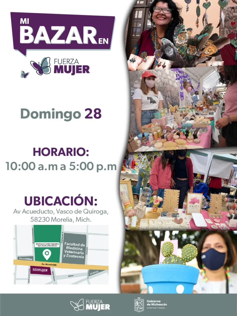 Morelia, Michoacán, a 25 de agosto del 2022.- El Gobierno de Michoacán, a través de la Secretaría de Igualdad Sustantiva y Desarrollo de las Mujeres Michoacanas (Seimujer), inaugurará “Mi bazar en Fuerza Mujer”, el próximo domingo 28 de agosto en el Centro Deportivo Ejército de la Revolución.