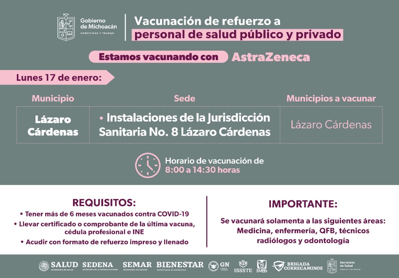 Para ello, hoy lunes 17 se estará vacunando en Morelia (Unidad Deportiva “Ejército de la Revolución); Sahuayo (Hospital General); Zamora (Hospital General) e Hidalgo (Deportivo Madero).