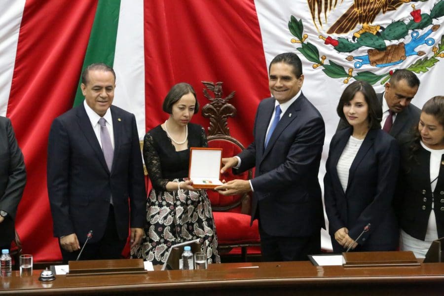 Morelia, Michoacán, a 3 de junio de 2017.- El Gobernador Constitucional Silvano Aureoles Conejo encabezó con los titulares de los Poderes Legislativo y Judicial, la entrega de la Presea Melchor Ocampo a María Auxilio Cárdenas Rodríguez, hija del muralista y especialista en plástica Agustín Cárdenas Castro, autor intelectual del escudo oficial del estado de Michoacán.