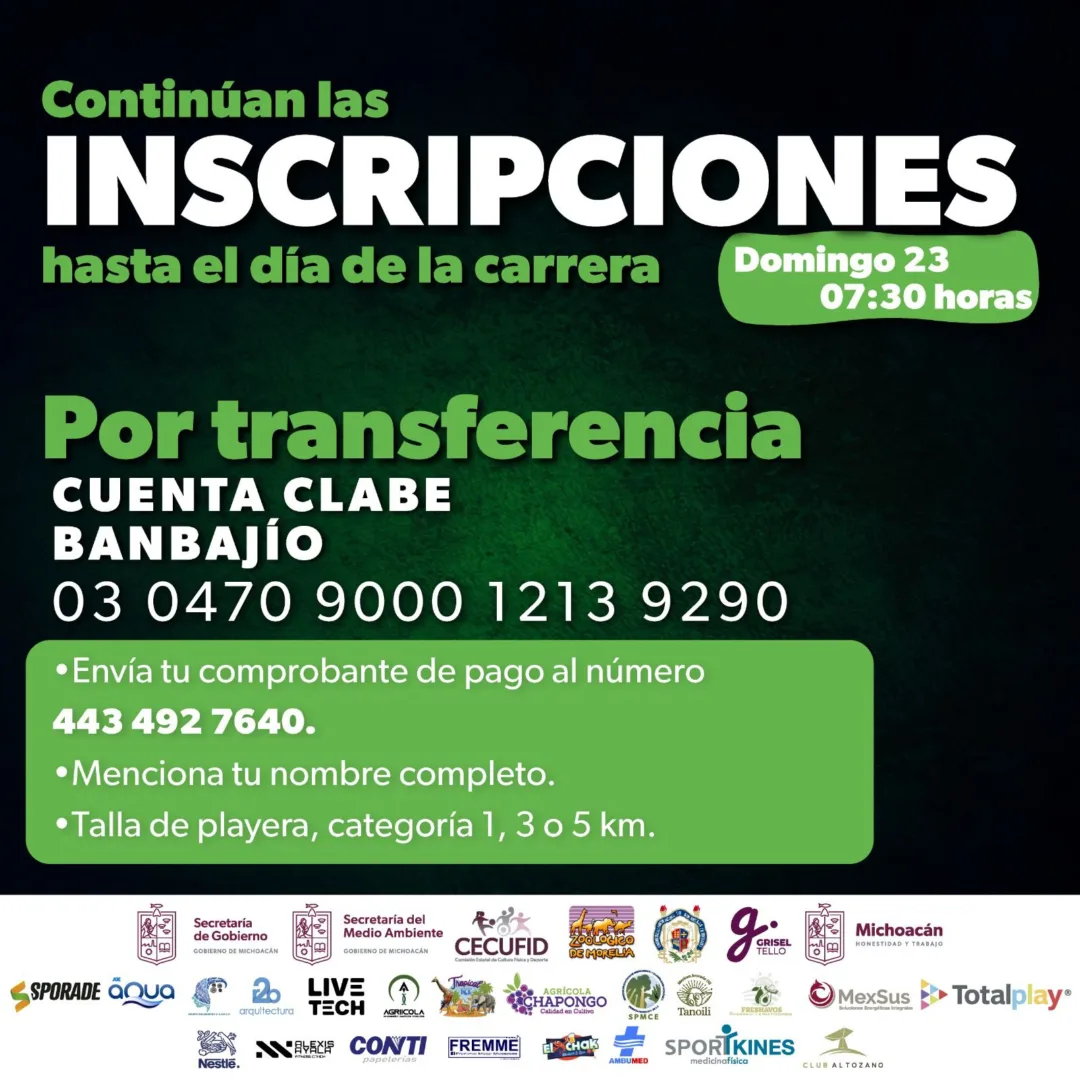 Para inscribirse en línea, pueden transferir a la Cuenta Clabe 030470900012139290 y enviar su comprobante de pago y datos (nombre completo, talla de playera, ruta a correr) al WhatsApp 443 492 7640 y pasar a recoger su kit antes de las 17:00 horas el sábado 22 de abril.