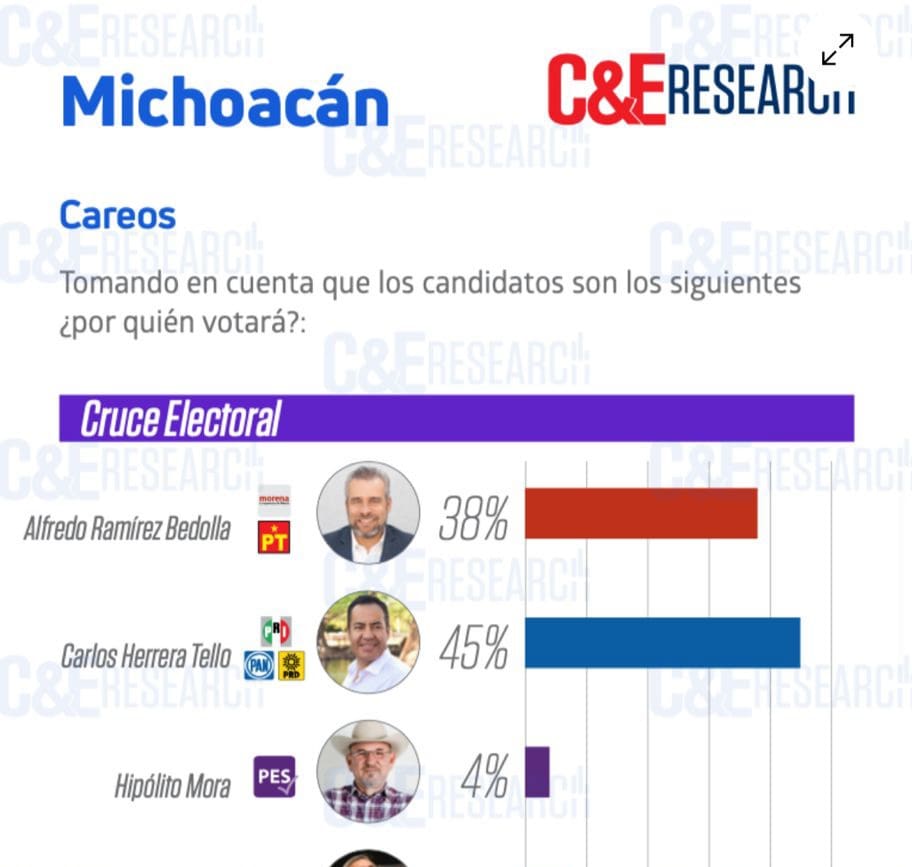 En la pregunta: Tomando en cuenta que los candidatos son los siguientes, ¿Por quién votará?, Alfredo Sánchez Bedolla de la coalición Morena-PT, tiene un 38 por ciento de aceptación; Carlos Herrera Tello de la alianza PRI, PAN y PRD con un 45 por ciento; Hipólito Mora del Partido Encuentro Solidario con un 4 por ciento; Cristóbal Arias Solís del Fuerza por México, con un 6 por ciento.