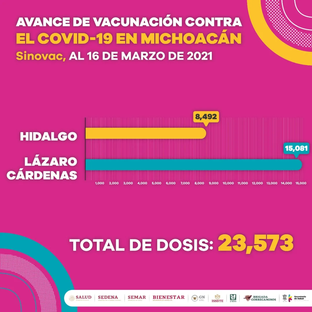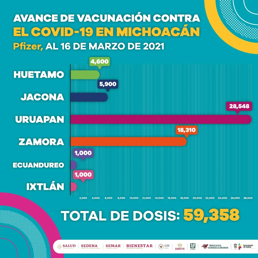 Trabajadores de la Secretaría de Salud de Michoacán (SSM), entre enfermeras, médicos y paramédicos, han participado en las jornadas de vacunación de Huetamo, Jacona, Uruapan, Zamora, Ecuandureo, Ixtlán, Hidalgo, Lázaro Cárdenas, Villamar, Aporo, Tingambato, Buenavista, Apatzingán, Parácuaro, Múgica, Angangueo, Coalcomán, Tepalcatepec, La Huacana, Aguililla y Churumuco.