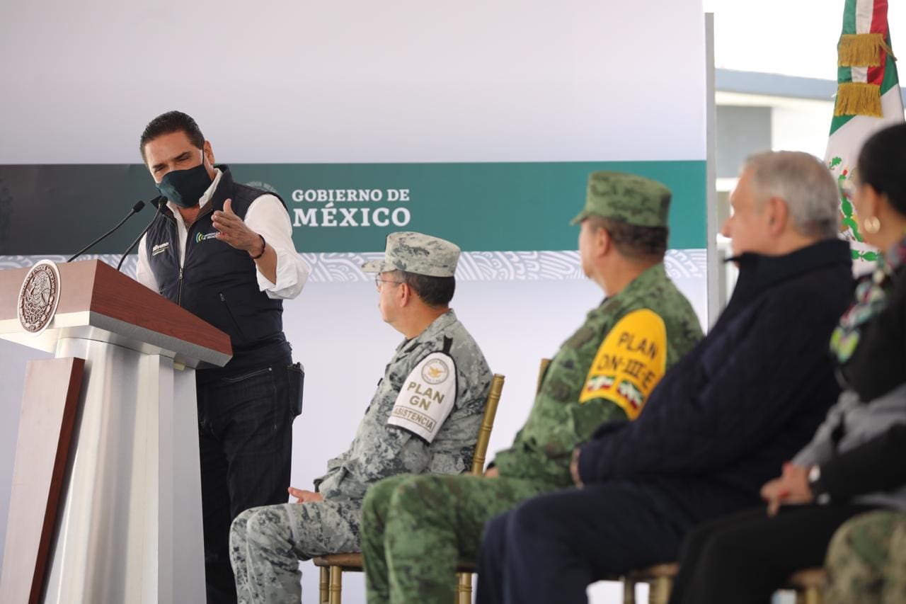 seguridad, en la construcción de la paz”, señaló el mandatario michoacano al presidente Andrés Manuel López Obrador, durante la inauguración del Cuartel de la Guardia Nacional en Maravatío.
