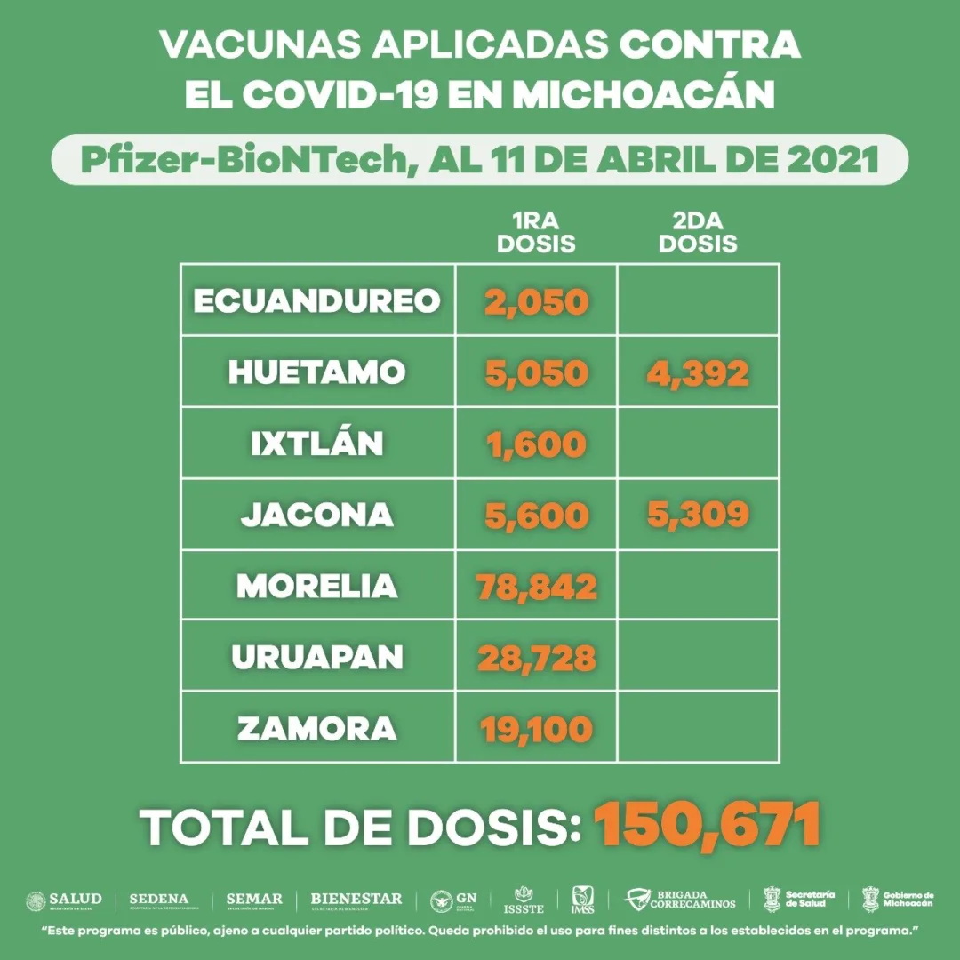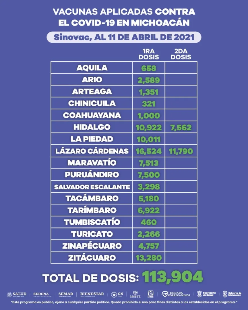 Morelia, Michoacán, a 11 de abril de 2021.- Desde que inició la jornada de inmunización anti COVID-19 en Michoacán hasta la fecha, 365 mil 580 adultos mayores de 60 años han sido vacunados.