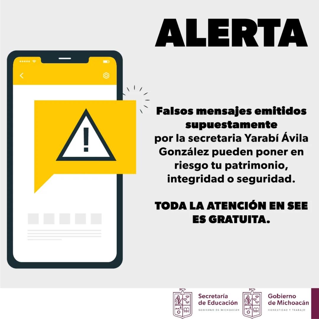 “Cualquier llamada telefónica, mensaje por cualquier aplicación móvil, correo electrónico u otra forma de comunicación no oficial que se reciba usando mi nombre, en mi supuesta representación o en la de otra servidora o servidor público de la Secretaría de Educación, para pedir dinero u otra contraprestación a cambio de los servicios de la Secretaría de Educaciónes totalmente falsa, por lo que los exhorto a estar alertas y no caer en el engaño, ya que sólo es para defraudarlos o extorsionarlos”.