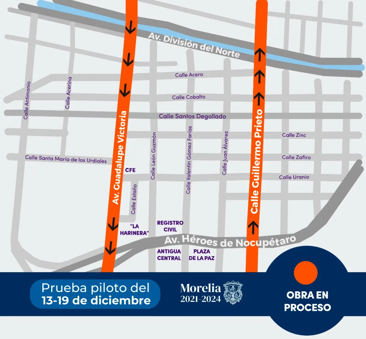 Morelia, Michoacán, 08 de diciembre de 2021.- Con el propósito de mejorar el tránsito vehicular en las zonas con mayor conflicto, el Gobierno Municipal, a través de la Secretaría de Movilidad y Espacio Público, realizará una prueba piloto en la avenida Guadalupe Victoria y la calle Guillermo Prieto.