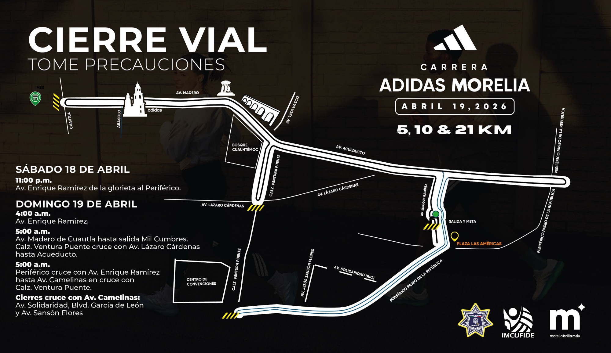 El Ayuntamiento de Morelia, a través del Instituto Municipal de Cultura Física y Deporte (Imcufide), informó que brindará apoyo logístico y operativo para la realización de la Carrera Adidas en sus modalidades de 5K, 10K y 21K. El evento deportivo está programado para el próximo 19 de abril y contará con la participación de diversas corporaciones de seguridad y auxilio para supervisar el desarrollo de la competencia.