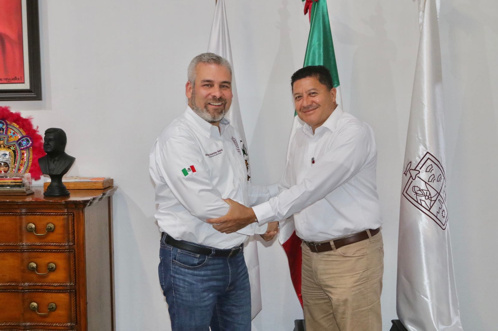 Morelia, Michoacán, 20 de julio 2022.- El gobernador Alfredo Ramírez Bedolla sostuvo reunión de trabajo con Esther Pedraza Santos y Feliciano Flores Anguiano, quienes acaban de asumir el cargo como delegados de Diconsa y Seguridad Alimentaria Mexicana (Segalmex) en Michoacán, respectivamente.