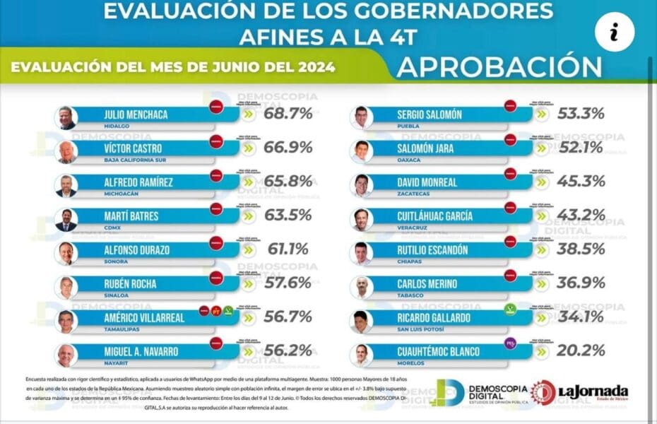 Ramírez Bedolla sólo se encuentra por debajo de Julio Menchaca, gobernador de Hidalgo con el 68.7 por ciento de aprobación y de Víctor Castro, gobernador de Baja California Sur con el 66.9 por ciento de aprobación.