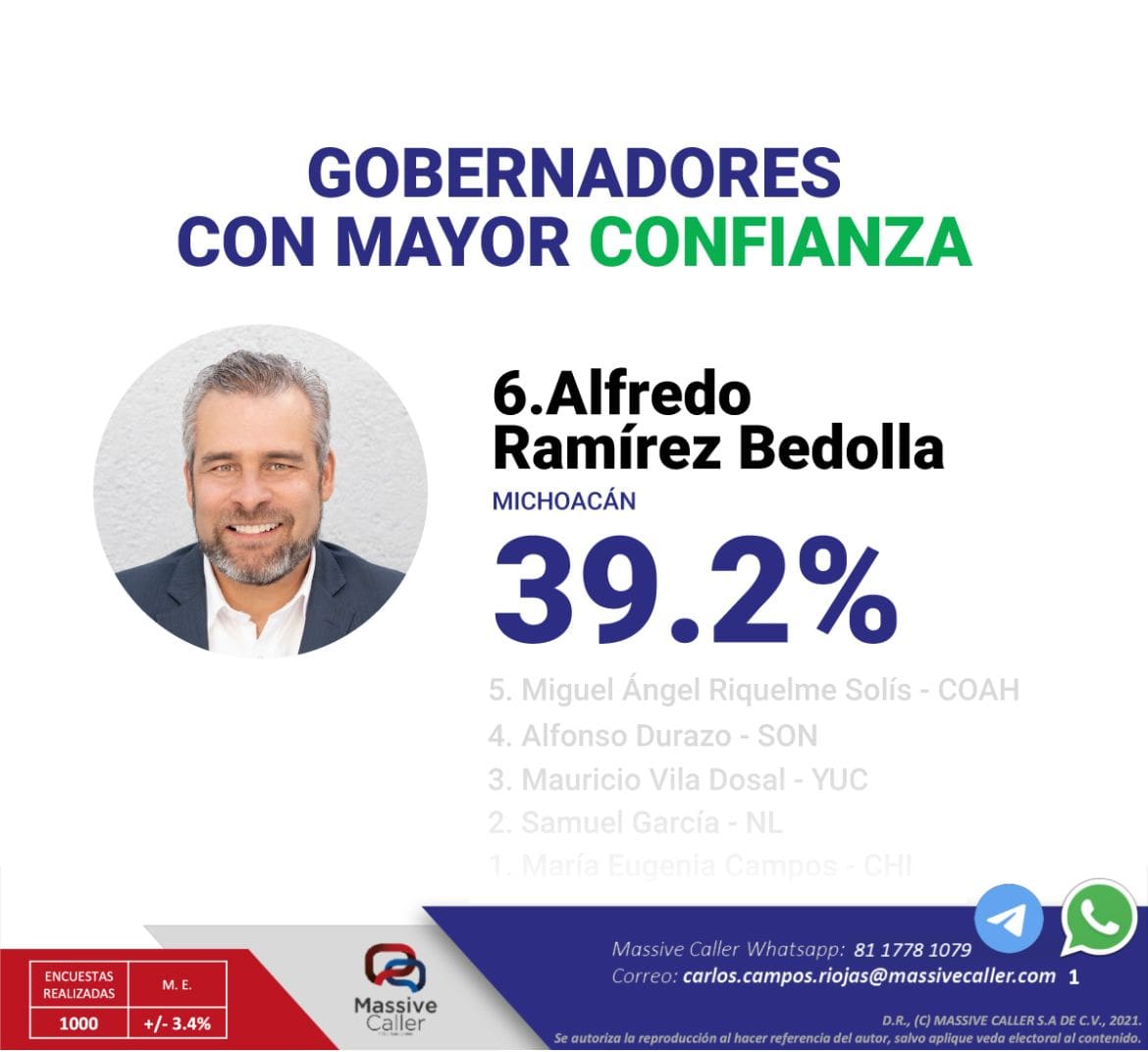 Bedolla escala al sexto lugar nacional en confianza según encuesta de Massive Caller
