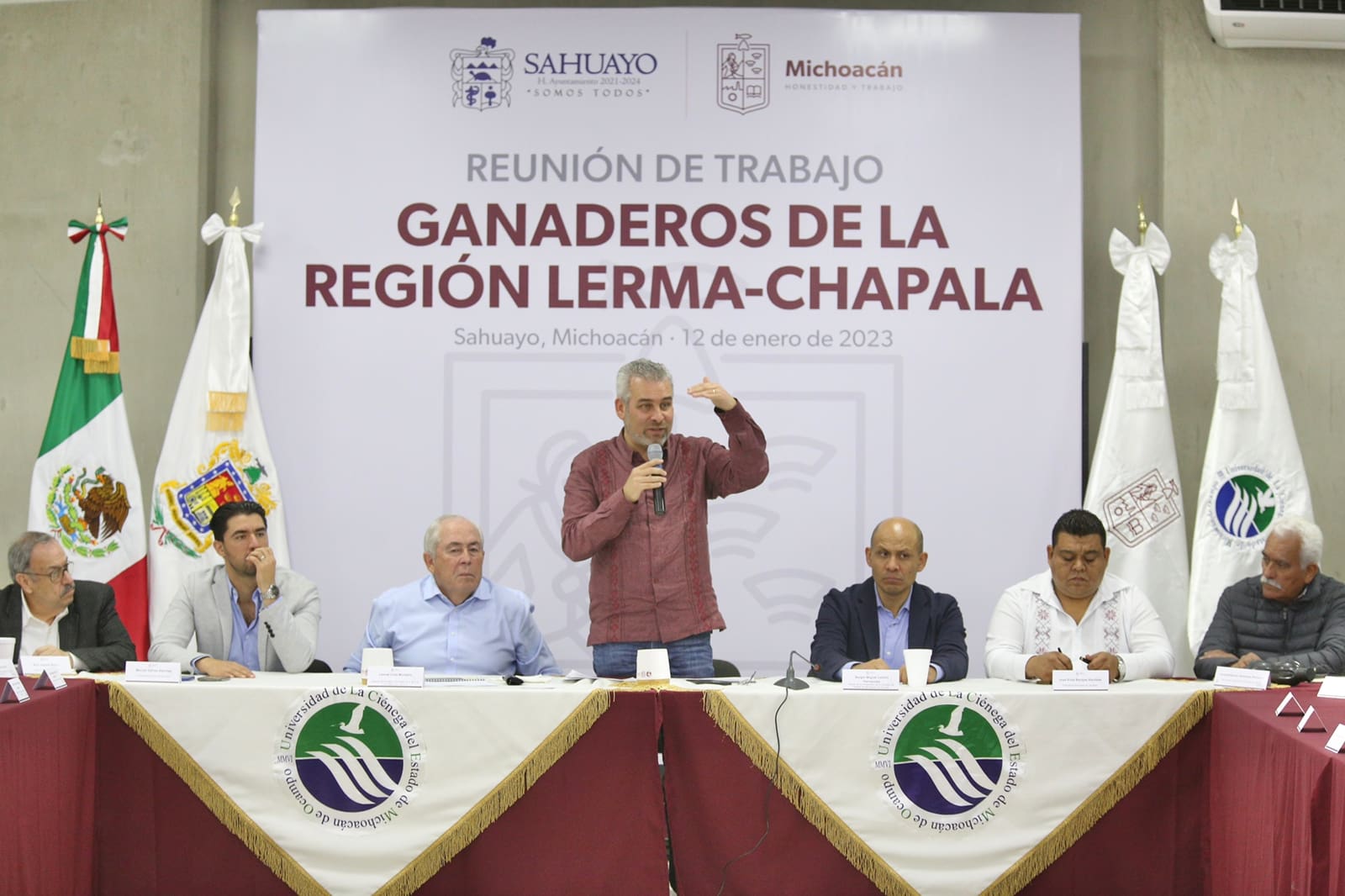 Jiquilpan, Michoacán, 12 de enero del 2023.- El gobernador Alfredo Ramírez Bedolla y el director general de Seguridad Alimentaria Mexicana (Segalmex), Leonel Cota Montaño, acordaron impulsar acciones conjuntas para fortalecer el sector ganadero y lechero de Michoacán.