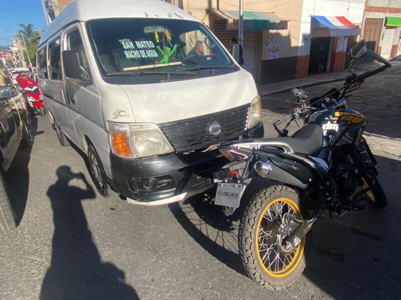 Elementos del Heroico Cuerpo de Bomberos de Zitácuaro respondieron a un reporte de accidente vial ocurrido la mañana de este jueves en la intersección de las calles José Ma. Coss Oriente y Leandro Valle Sur. El incidente involucró a una motocicleta de la marca Italika, tipo DM 300, y una unidad de transporte público tipo combi (Nissan Urvan).